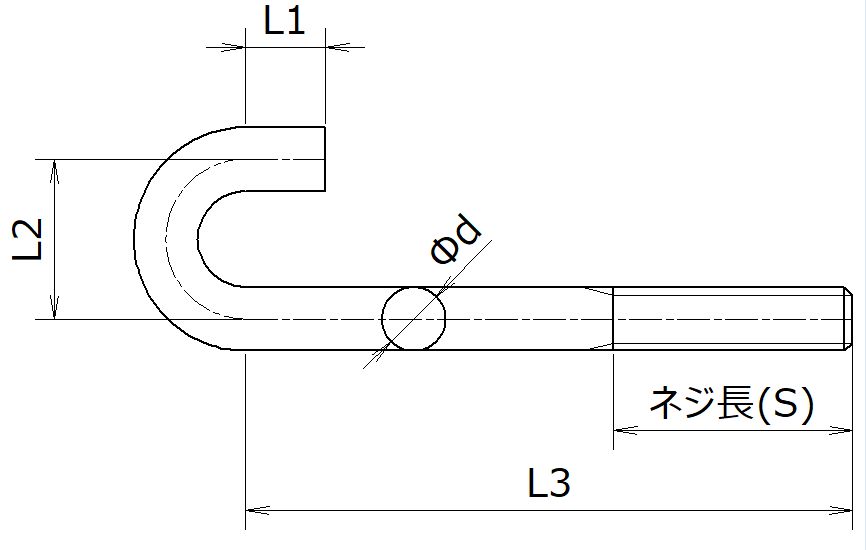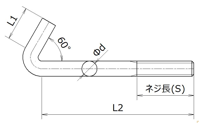 製作可能サイズ(φd) M6、M8、M10、M12、M16 ねじ長さ等、ご相談ください。 ねじ長さ(S):20~40㎜が基本です。それ以外の長さについてはご相談ください。 フックボルト、Jフックボルト等も製作可能です。 ※画像は溶融亜鉛めっき品です